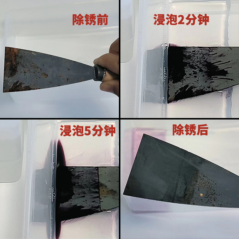 這種中性除銹劑具有如下優(yōu)點:1.它是一種溫和的中性水基溶液,無酸堿性,不會對鈦合金造成腐蝕作用,對其周圍的其他材質(zhì),例如金屬,敏感的橡膠,塑料都無腐蝕。2.它在5分鐘內(nèi)就可完成清除,速度快效果好,無論是浸泡,噴霧,還是刷涂都具有良好效果,操作靈活便捷。3.它是環(huán)保可直排的除銹劑,不含有害物質(zhì),對人體和環(huán)境無害,可以直接排放。4.它除銹效果好,與氧化物反應,將其變?yōu)樗苄缘囊浊鍧嵉木酆衔?,僅需清水即可沖洗干凈并烘干,即可恢復亮潔。5.它不閃銹返銹,無需其他處理即可提供4周的防銹保護。6.它是除銹+清潔+防銹3合1,烘干后,可以直接電鍍或噴漆。