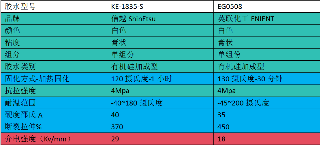 對比KE1835S膠水,EG0508擁有相同的操作和固化方式,并且強(qiáng)度相同,彈性,柔軟差異較小,同時擁有更高的耐溫范圍;差異:KE1835S的絕緣性更強(qiáng),而EG0508也達(dá)到18Kv,也已經(jīng)是較高介電強(qiáng)度。預(yù)計(jì)可以適用客戶的絕緣需求。