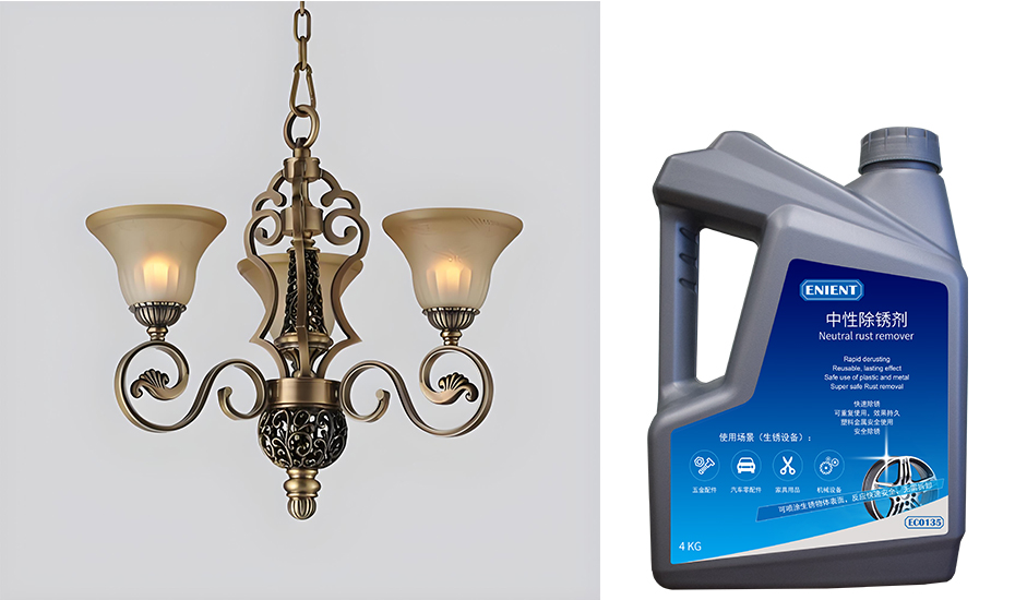 今天,我們就來分享一個(gè)實(shí)際案例,使用ENIENT®EC0135中性除銹劑解決了黃銅吊燈的生銹問題。