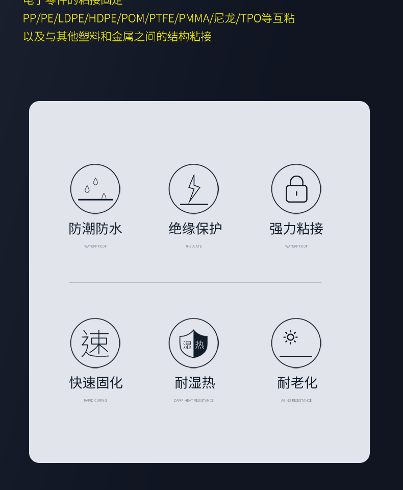 · 粘接性強(qiáng):專門用于聚烯烴(PP、PE、LDPE、HDPE 等),以及低表面能的基材(PTFE、PMMA、尼龍、TPO、PU 等)的相互粘接以及低表面能材料與其他塑料、金屬、復(fù)合材料、橡膠等常見材質(zhì)的粘接。